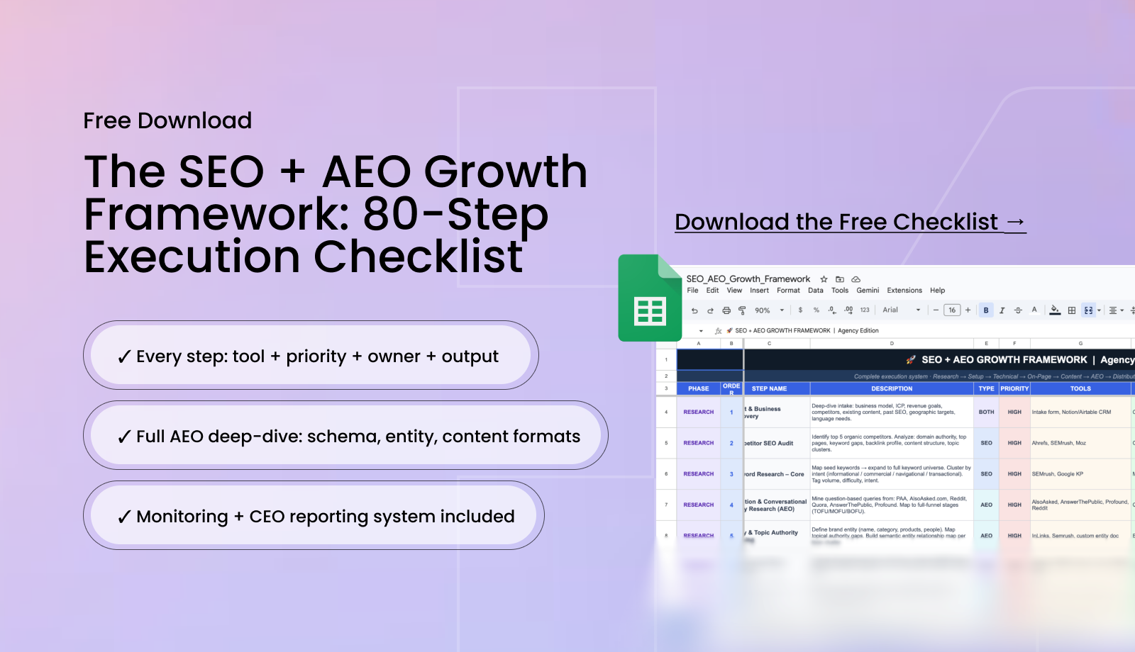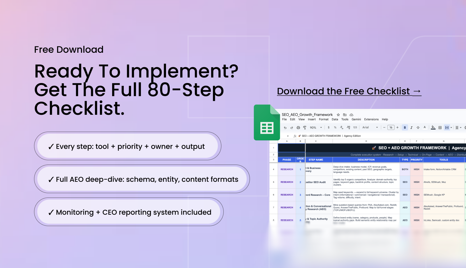 Every step is mapped to the right tool, priority, and output. If you want the full system in a ready-to-use format, you can download the free 80-step SEO + AEO checklist as a Google Sheet and work through it alongside this guide, each phase below maps directly to the checklist.